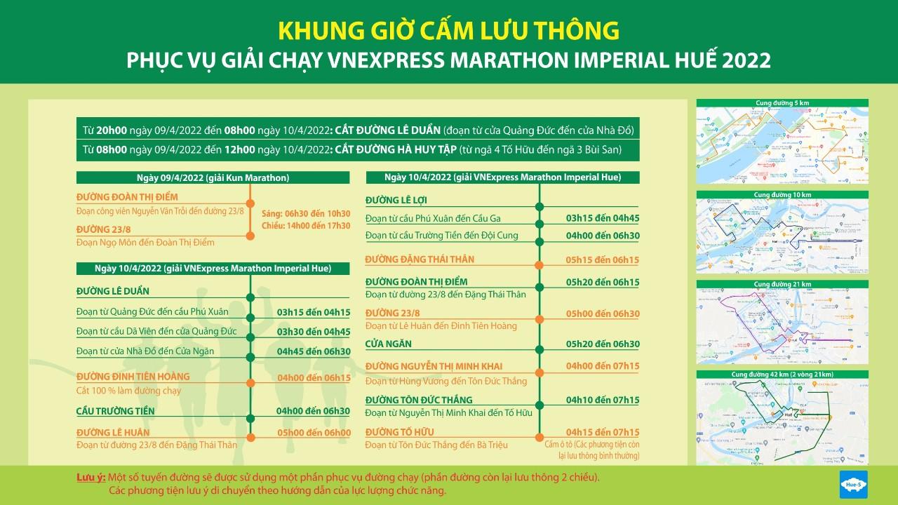- Ngày 10/4/2022, cắt đường đảm bảo các nội dung thi đấu phục vụ giải chạy VN Express Marathon Imperial Huế, cụ thể: